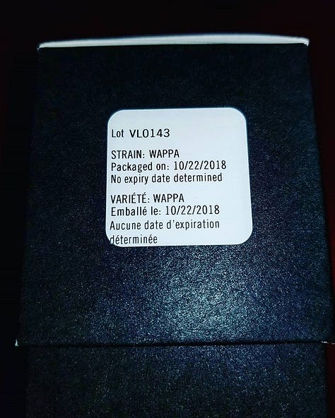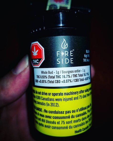Black by Fireside Cannabis through ABcann Medicinals Inc. The box tells me that the strain name for this cannabis is Wappa and it was packaged on 10/22/2018. It also says this whole bud weighing 1 gram has a total THC of 16.7% & a total CBD of 0.07%. The box also says High THC, but is 16% really all that high? Cracked open the container and the first thing I noticed was the static cling on the inside of the container. The buds looked nice and surprisingly had some life left in them, i.e. they weren't bone dry. The buds themselves had little to no smell. The buds weighed 1 gram and were ground up nicely and found their resting spot rolled up tightly in a joint. I really enjoyed smoking this weed. It was a slow burning joint that at times felt like it was never ending. I found it very smooth with an enjoyable flavour. The buzz I got from the reefer was enjoyable but I felt for this being called "High THC", I should have been a lot higher! I paid $13.15 (plus tax & shipping) for 1 gram of cannabis. I believe this might be the most expensive 1 gram purchase I've made from the OCS. I'd rate this Wappa a 7.5/10. I had to deduct points due to the "High THC" not being high enough. Still a very satisfying smoke!