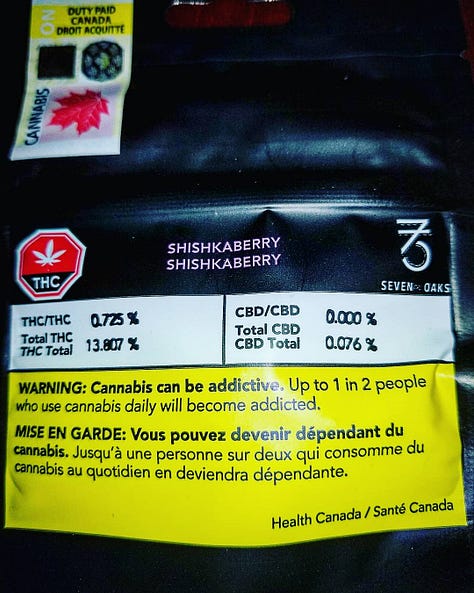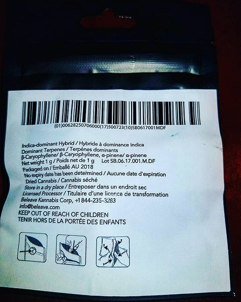 Seven Oaks from Beleave Inc. with their Shishkaberry was the next one up in my samplings purchased from the OCS. The package tells me that the total THC is 13.807% & the total CBD is 0.076%. On the back of the package it gave me more information like that this is an indica-dominant hybrid. This cannabis was packaged AU 2018 & has a net weight of 1 g. Interesting to note, the package included dominant terpenes which happen to be caryophyllene & pinene. The weed did indeed weigh 1 gram. The nug I found in the bag was a nice looking one with a stale cotton candy feel and a berry-like aroma. Rolled up a nice cone & it burnt beautifully. Nice earthy flavour with a pleasant after taste. I found it super smooth as well. This cannabis brought on a really nice buzz. Had a soothing/numbing head buzz to it that I really enjoyed. Safe to say I was a big fan of this one! I paid $10.60 (plus tax & shipping) for 1 gram. I'd rate this one a 9/10.